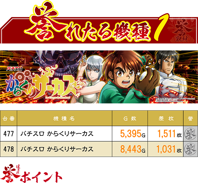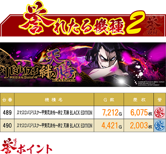 見事,6000枚オーバーを果たし、赤誉アイコンをGETした489番台。何気にお隣の490番台も好調で、2,000枚超えを達成していた。