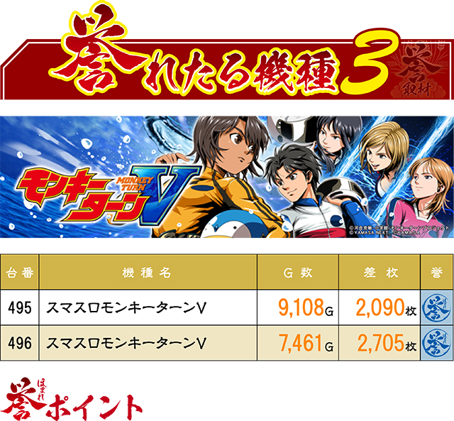 前回と同じく、今回も『スマスロモンキーターンV』から好記録が出現!隣同士で2,000枚オーバーしていたのは、2台ともが優秀台だったから…!?