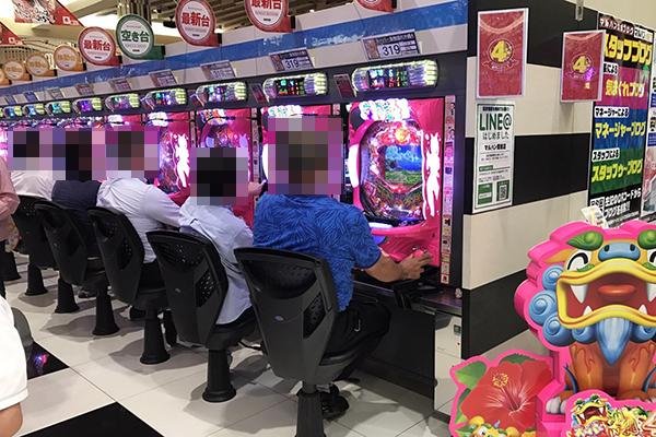 4円パチンコは午前に引き続き、海物語シリーズが盛況。なかでも、新台の「CRスーパー海物語IN沖縄4」の活躍が目立ち、注目を集めていた。