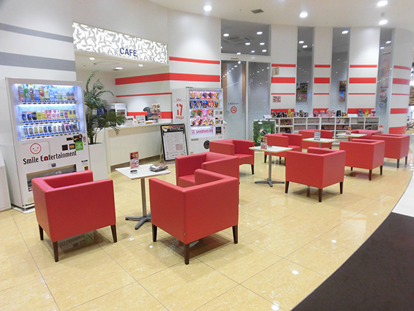 広々としたレストコーナーの高級感がある赤いソファーも印象的。カルピスマンゴーや梅こぶ茶といったドリンクが取り揃えられたカフェも併設されているので、ひと息つくことができるだろう。