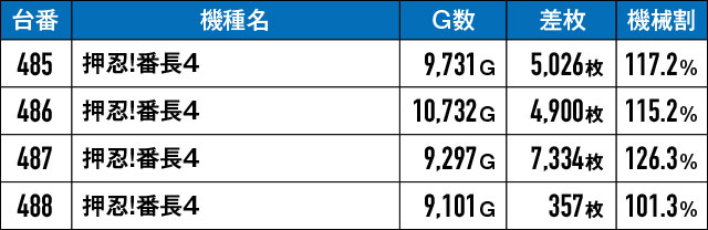 『押忍!番長4』は4台並んでプラっていただけでなく、内3台が+4,500枚オーバーという常識外れの結果となった。優秀台が4台も並ぶとこんなことになる…!