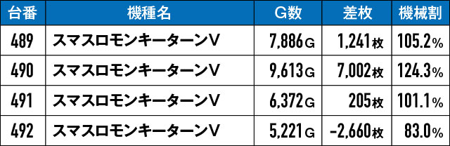 『スマスロモンキーターンV』の490番台が7,000枚超えを達成!さらにその両隣の台もしっかりプラっていたことから、もしかしたら優秀台の4台並びだったのかもしれない。