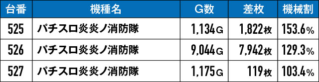 3台設置の『パチスロ炎炎ノ消防隊』も3台並んでプラス差枚。特に真ん中の526番台は8,000枚に迫るモンスターレコードを叩き出し、店内の盛り上がりを加速させた。