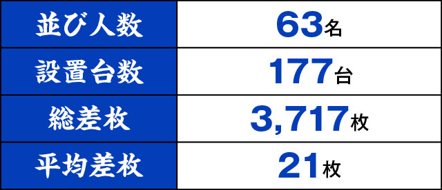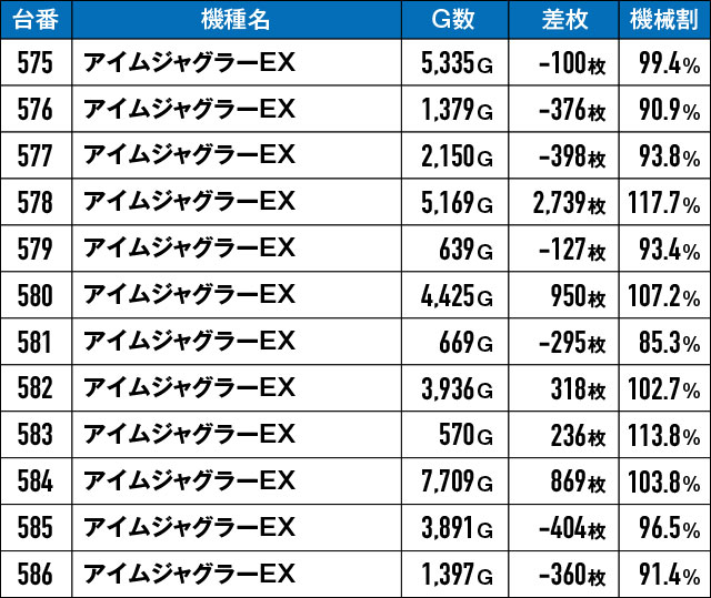 なんと『アイムジャグラーEX』コーナーにて、12台並びと思しき状況に遭遇!好挙動を示す台もあったが、全体的に総ゲーム数が少なく、思うような結果にはならず…。