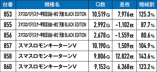 『スマスロバジリスク~甲賀忍法帖~絆2 天膳 BLACK EDITION』と『スマスロモンキーターンV』が連なるこちらの6台から6,000枚超えが3台も誕生!半数が6,000枚を超えていたという状況は、6台並びだったことを裏付けている…!?