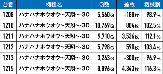『ハナハナホウオウ~天翔~-30』も6台並んで怪しい気配がプンプン…。7割近い勝率に加え、3,500枚オーバーが2台とくれば、これはやっぱり6台並びで間違いない…!?