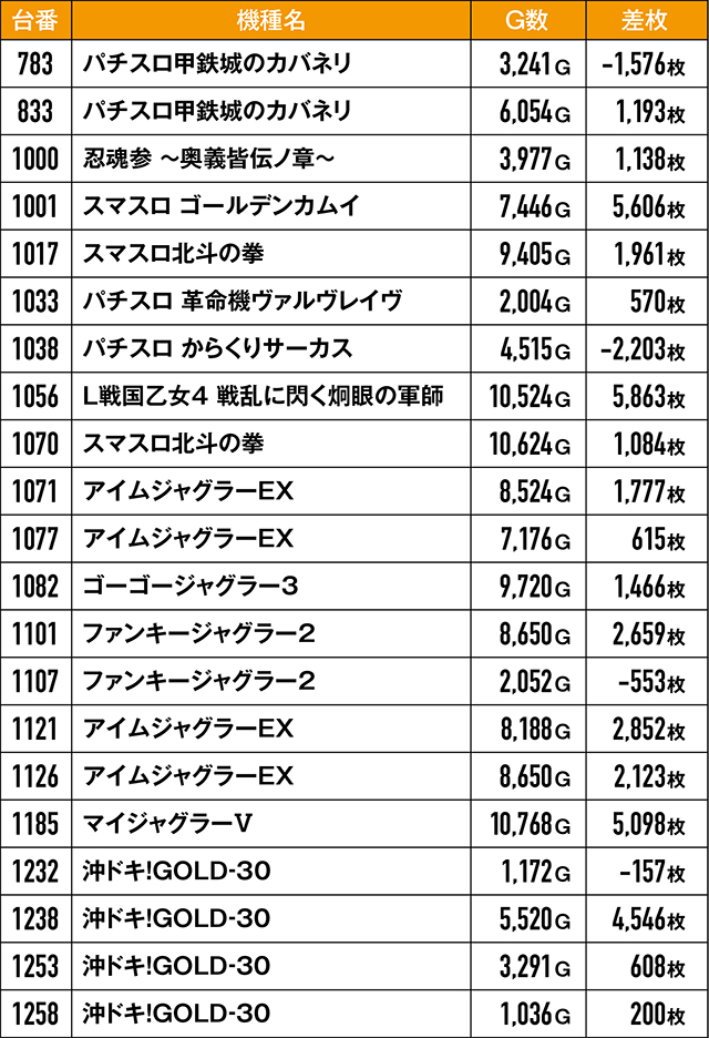 優秀台の6台並びばかりにスポットライトが当たりがちだが、実は単品でも好結果を残していた台がこんなにも!4,000枚オーバー台が実に4台も生まれていた。取材班の予想通り、並び以外に単品でもしっかり潜んでいたのは間違いないだろう。