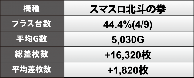 『スマスロ北斗の拳』では勝率は5割に及ばなかったものの、上位層では+7千9百枚超&+5千7百枚弱&+4千6百枚弱が1台ずつ生まれ、9台トータルで+1万6千枚超を記録した。