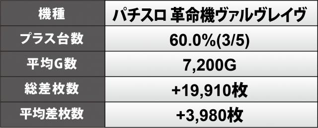 『パチスロ 革命機ヴァルヴレイヴ』は勝率6割、+1万7千枚弱&+5千8百枚弱がワンツーフィニッシュとなったことから、5台の合計では+2万枚間近となった。