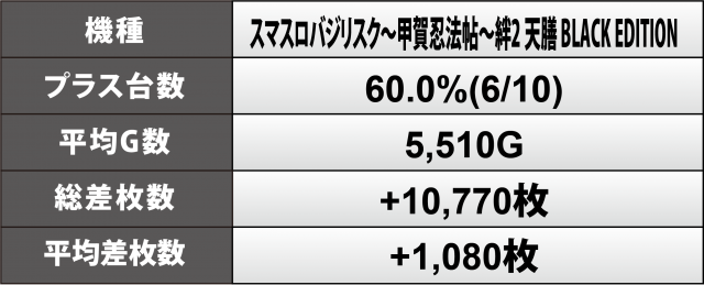最後は『スマスロバジリスク~甲賀忍法帖~絆2 天膳 BLACK EDITION』。こちらも全体の6割がプレイヤーの勝利となり、プラスになった6台全てが4桁プラス&+5千8百枚超&+3千5百枚弱が1台ずつ生み出された。