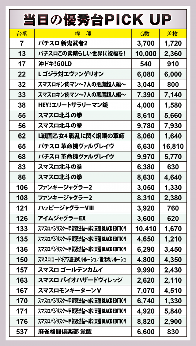 以下、当日の出玉データからハイスコア台の詳細に迫っていこう。
