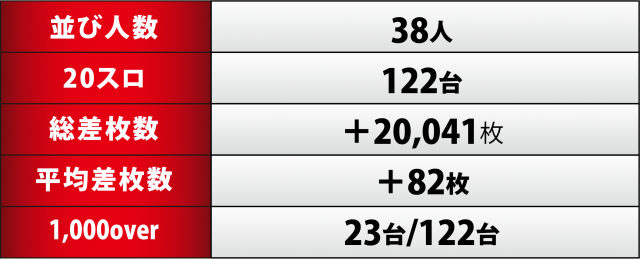 その初戦には取材班と並んで同店に駆け付けたファンの大きな期待が懸かったが、その結果は…21.277スロの全台で+2万枚オーバーによる数値を叩き出し、見事白星スタートを切ることに成功した。