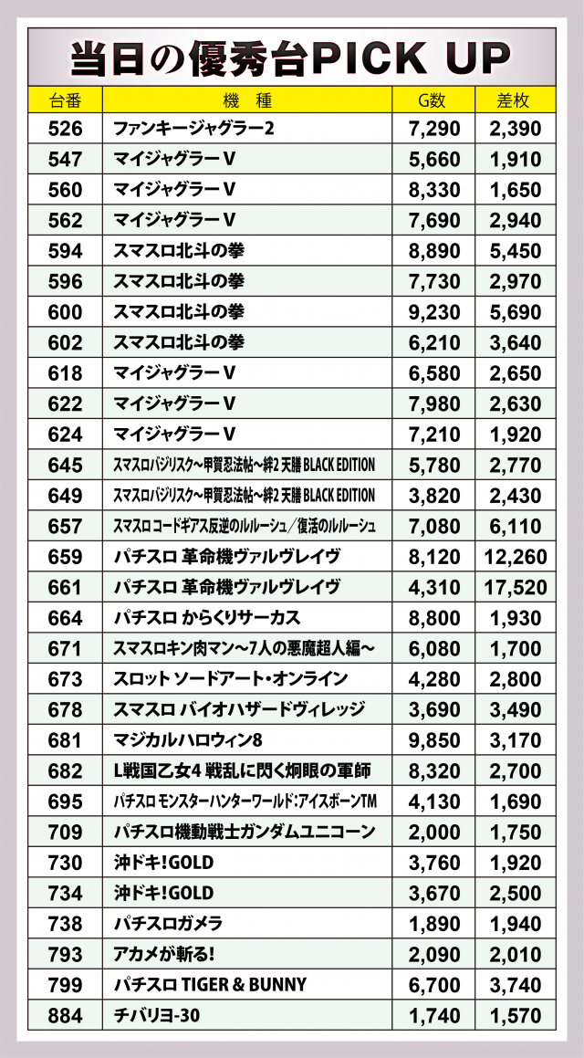 ここからは、当日の出玉データをチェックし、優秀台の詳細を振り返っていこう。