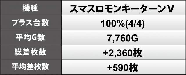 『スマスロモンキーターンⅤ』は合計枚数ではあまり多くなかったが、4台全てがプレイヤーの勝利となった。