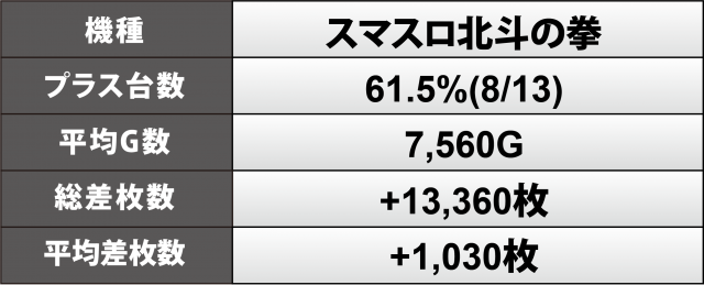 『スマスロ北斗の拳』は勝率6割超、+5千枚オーバーが2台飛び出したこともあり、13台のトータルでは+1万3千枚をクリア。
