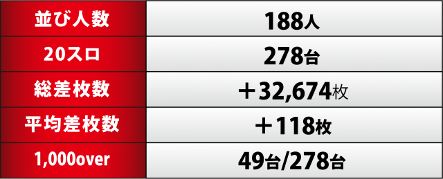 この日1,000overを達成したのは49台。上位30台の内全体の3分の2となる20台が+2千枚以上の差枚数を成し遂げ、+3千枚以上は9台、+5千枚オーバーは5台、+6千枚オーバーは3台となった。
