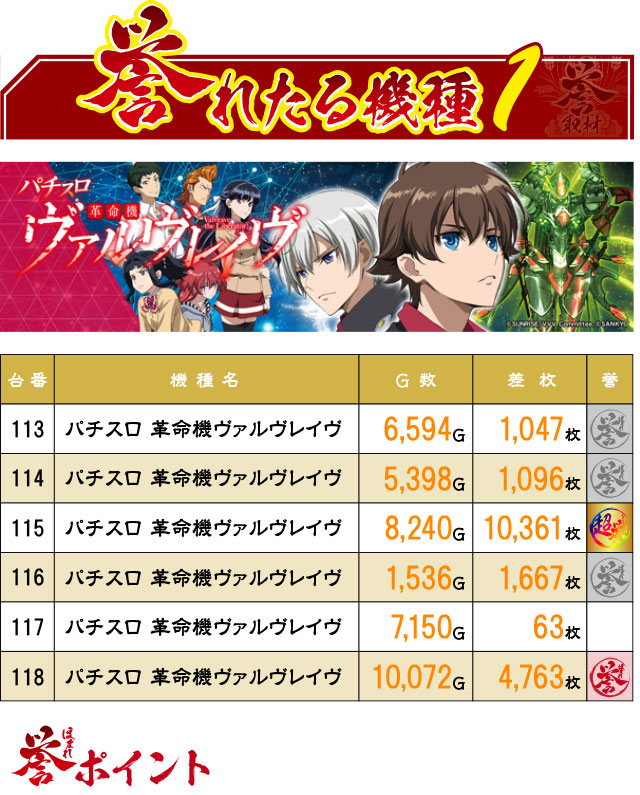 6台設置の『パチスロ 革命機ヴァルヴレイヴ』は、全台がプラス!しかも5台に誉マークがつくほどの盛り上がりを見せてくれた。中でも115番台がすごかった…!
