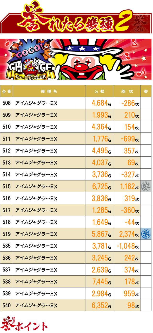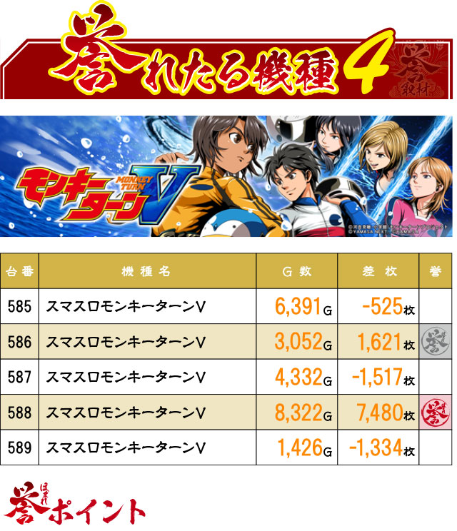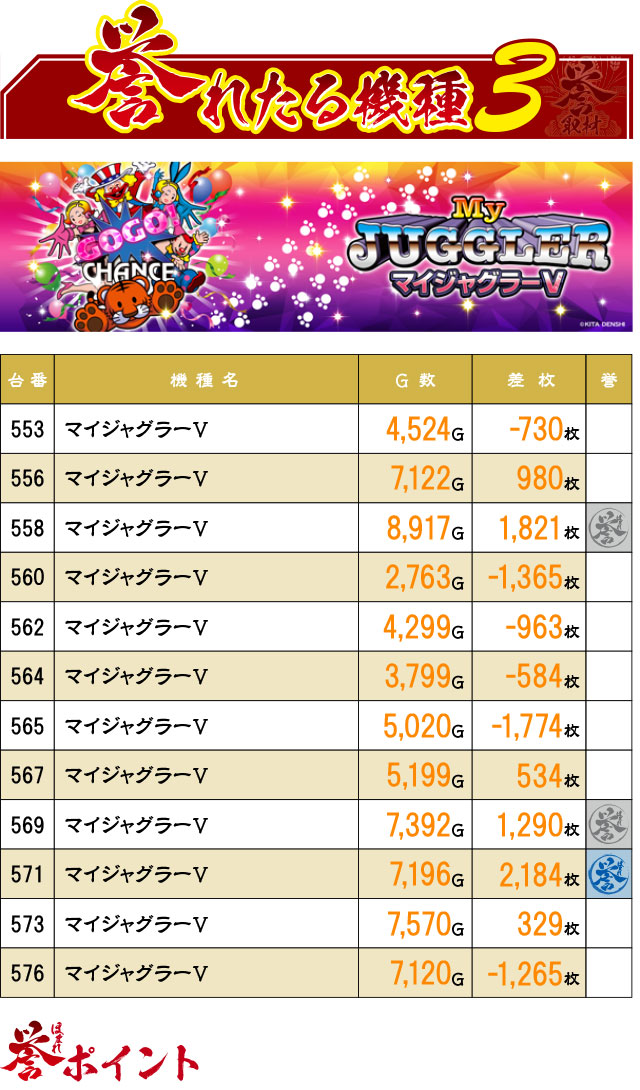 『マイジャグラーⅤ』もこの日はナリを潜めていた印象。もちろん誉マーキング台はあったが、こちらも次回の盛り返しを大いに期待したい。