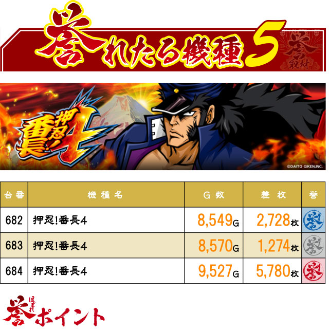 3台設置の『押忍!番長4』は3台ともが文句なしのプラスに。もちろん3台ともに誉マークがついていたのは言うまでもないだろう。注目は危なげなく6,000枚近い記録を叩き出した684番台!