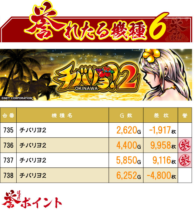 導入されたばかりの『チバリヨ2』がいきなりの大活躍!なんと半数の2台が9,000枚オーバーを達成したというのだから驚くほかない。