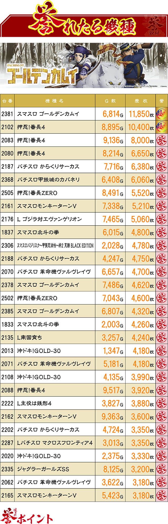 この日のスロ差枚1・2位レコードがとんでもないことに…!さらに3位以下にも5,000枚オーバー記録が続き、パチスロコーナーはてんやわんやだった。注目は新台として仲間入りしたばかりの『押忍!番長4』から複数の好レコードが生まれていたことだろう。