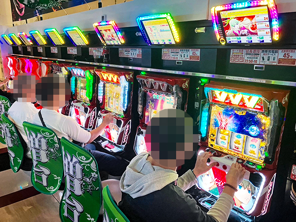 1000円/180枚・2円パチスロの盛り上がりも大きく、コーナー全体がプレイヤーの熱気に包まれていた。