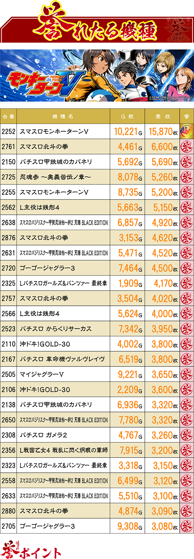 3,000枚オーバー記録が大量に生まれたこの日。ご覧の通り、赤誉マークだらけとなったわけだが、その中で2位以下を大きく引き離し、首位の座についたのは『スマスロモンキーターンV』だった。また、『ジャグラー』シリーズからも目の覚めるような記録が続々出現!