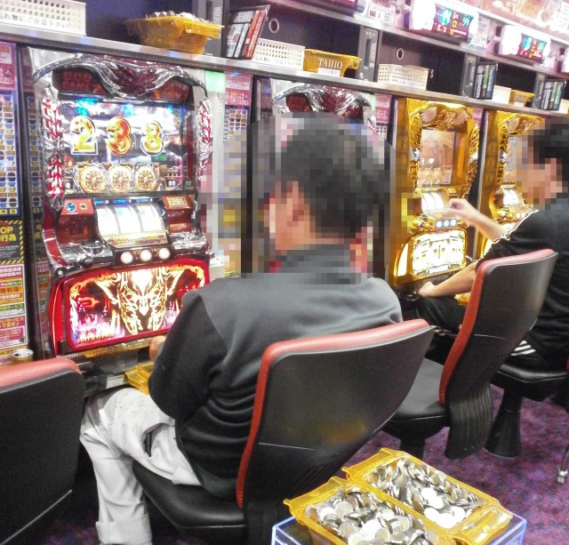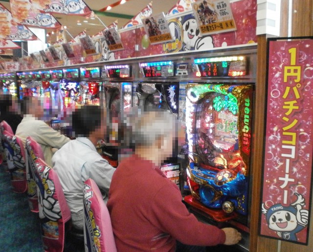 1円パチンココーナーの稼働率も高い。幅広いスペックの機種が楽しまれており、プレイヤーたちは満面の笑みを浮かべていた。