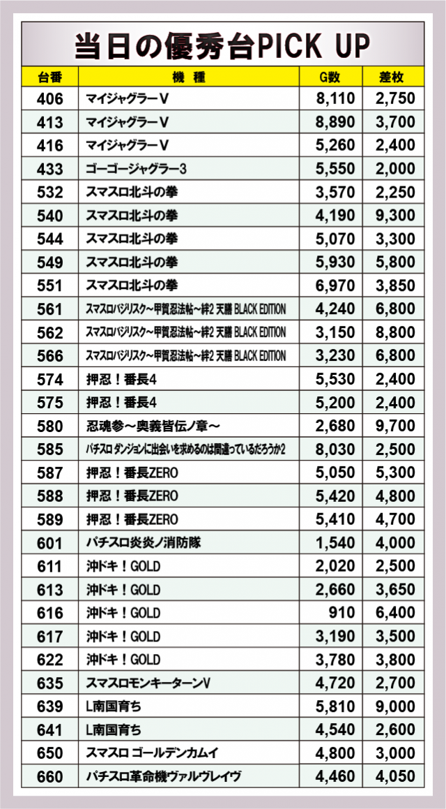 優秀台として名を連ねた30台をみると、差枚数で大きな数字を打ち立てたのが『忍魂参~奥義皆伝ノ章~』580番台+9,700枚だ。これに続いて『スマスロ北斗の拳』540番台+9,300枚、『L南国育ち』639番台+9000枚と各台で大きな熱気が放たれていた。その他、様々な機種がランクインしており、ファンは相当な手ごたえを感じていたことだろう。