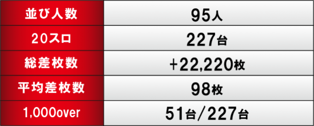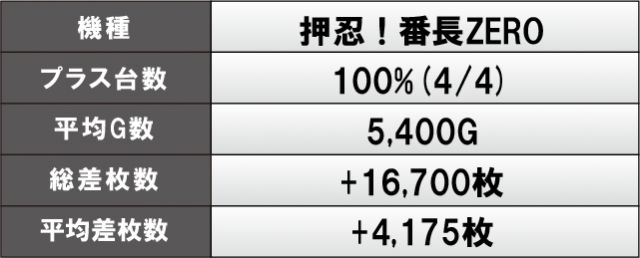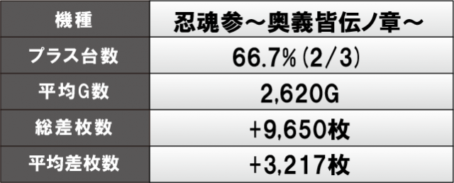 『押忍!番長ZERO』は全4台がプラス差枚を達成し、平均差枚は+4,175枚と当日トップクラスの好成績をマーク!また、導入されたばかりの新台『忍魂参~奥義皆伝ノ章~』も奮起しており、平均G数こそ振るわないものの、高い熱量でファンに満足度の高い1日を提供していたと言える。