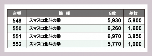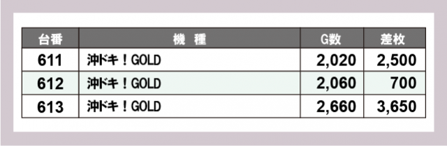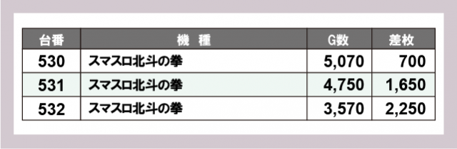 続いては、横並びで盛り上がっていた3機種を紹介。まず『マイジャグラーⅤ』では、多くの回転数が記録されるだけでなく、コンスタントな大当りも確認できた。413番台+3,700枚と大きな差枚数を残し、ファンは恍惚の表情を浮かべていたことだろう。次いで『スマスロ北斗の拳』は、2箇所の横並び好況スポットが発生し、安定した記録が目に焼きつく。さらに『沖ドキ!GOLD』は、少ないG数ながら気を吐いており、人気機種としての実力を発揮していたと言える。
