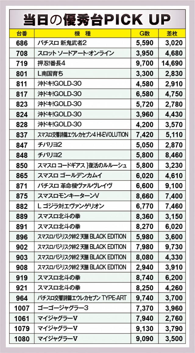 『押忍!番長4』719番台+14,690枚という記録に目を奪われてしまうが、ほかにも『チバリヨ2』848番台+8,460枚や『パチスロ 革命機ヴァルヴレイヴ』871番台+9,100枚、『スマスロバジリスク~甲賀忍法帖~絆2 天膳 BLACK EDITION』902番台+9,730枚といった熱量も見られる。回転数にしても閉店まで打ち込まれた様子が窺えるため、手ごたえを感じていたのは間違いない。