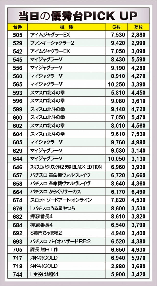 優秀台には『マイジャグラーⅤ』『スマスロ北斗の拳』が多く名を連ねており、人気機種が中心となって盛り上がりを形成していたのが分かる。604番台+7,530枚と大きな熱気が放たれれば、『パチスロ からくりサーカス』664番台+6,490枚など、各所でファンが笑顔を浮かる光景が広がっていた。新旧問わず幅広い機種が活躍していることから、あらゆる場所にチャンスがあったと言えるだろう。