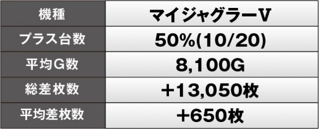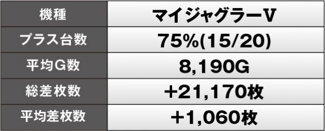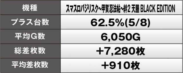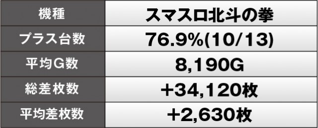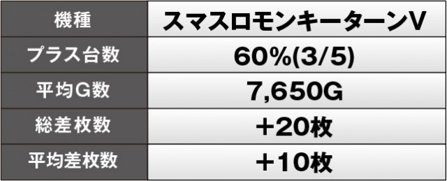 『マイジャグラーⅤ』は総設置台40台となっているが、半数以上がプラス差枚でフィニッシュ。総差枚数も5桁を記録しており、コンスタントにGOGOランプが輝いていた事実が窺える。また『スマスロ北斗の拳』は圧巻のパフォーマンスを披露し、総差枚数+34,120枚をマーク。『スマスロモンキーターンV』『スマスロバジリスク~甲賀忍法帖~絆2 天膳 BLACK EDITION』の勝利も高く、しっかりと存在感をアピールしていた。