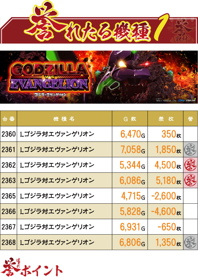 『Lゴジラ対エヴァンゲリオン』全8台中、半数の4台に誉マーキング!特に赤誉マークの2台は揃って+4,500枚を超えるほど圧倒的な力を見せつけてくれた。