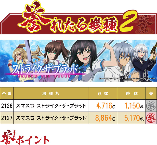 常連ユーザーを驚かせたのは、2台設置で2台ともがプラス、さらに2127番台が+5,000枚オーバーを果たした『スマスロ ストライク・ザ・ブラッド』。もしや2台ともが優秀台だった…!?