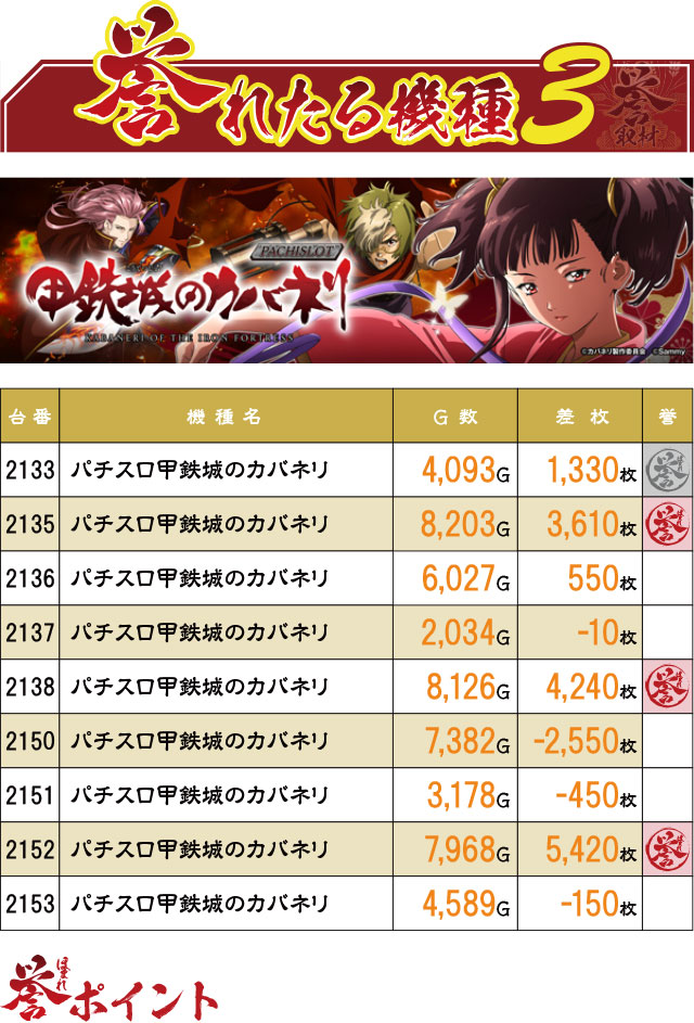 毎度しっかり暴れてくれる『パチスロ甲鉄城のカバネリ』から、この日も3,000枚超え・4,000枚超え・5,000枚超えが誕生。マイナス台は4台あったが、3台が誤差レベルの微マイナスだった。