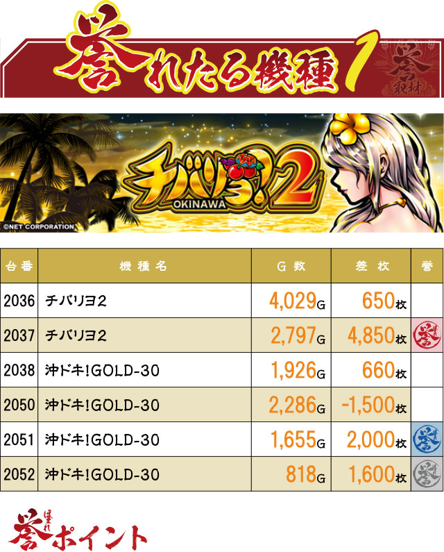 沖スロコーナーが大きな盛り上がりを見せていたこの日。特に『チバリヨ2』と『沖ドキ!GOLD-30』が連なるこちらのブロックには誉マークが多く、2037番台からは5,000枚に迫る結果が飛び出した!
