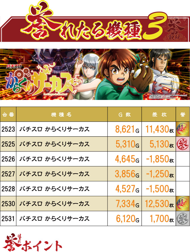 なんとこの日、『パチスロ からくりサーカス』から2台の10,000枚オーバー台が出現!この2台と5,000枚超えを果たした2525番台の計3台は、明らかに優秀台ムーブを見せていたようだ。