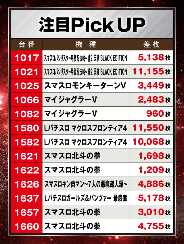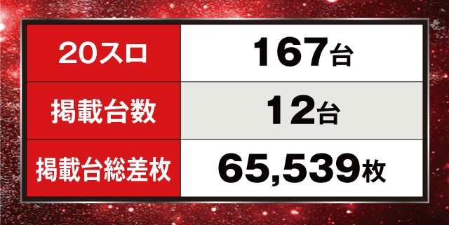 特出すべきは総差枚数!13台で+65,539枚・平均+5,041枚と凄まじい記録だ。やはり目立っていたのがスマスロで、『スマスロバジリスク~甲賀忍法帖~絆2 天膳 BLACK EDITION』と『Lパチスロ マクロスフロンティア4』2台が万枚オーバーと、機種のポテンシャルを最大限に発揮できていた。