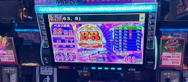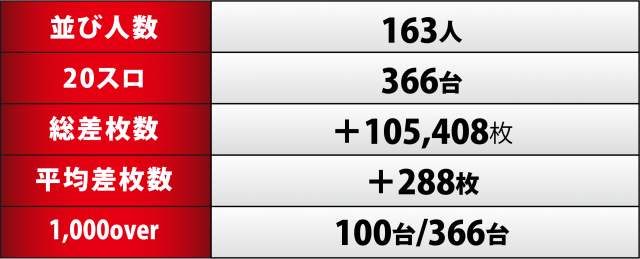 この日、[1000円/46枚]スロ全366台の総計では差枚数+105,408枚と、「英雄のリアル」の中でも屈指の好レコードを叩き出した。大型連休の序盤と言える情勢の中、これだけの数字が飛び出したことは驚くと共に喜ばしいの一言。