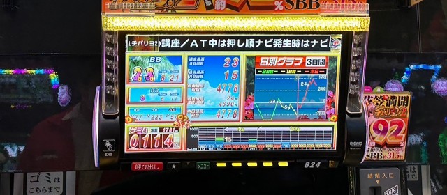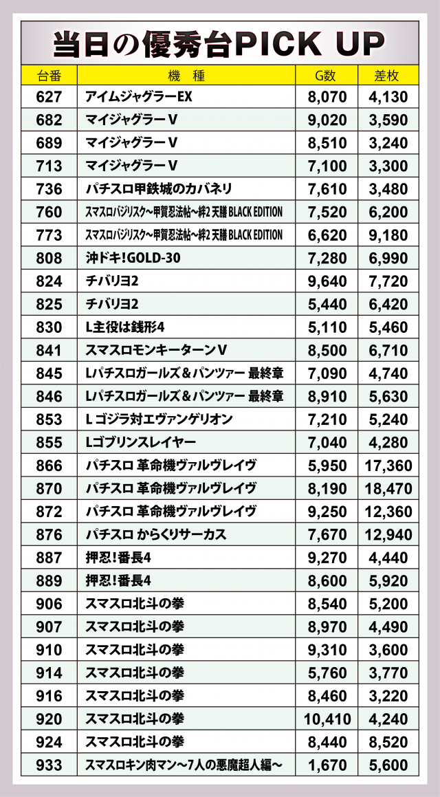 以下、当日の出玉データを細かく見つめていき、具体的にお知らせしていこう。