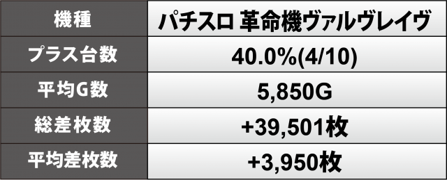 中では注目はプラス5桁の台を3台も生み出した『パチスロ 革命機ヴァルヴレイヴ』。勝率こそ半数を切ってしまったが、合計では+4万枚目前を成し遂げ、この日一番の盛り上がりとなった。