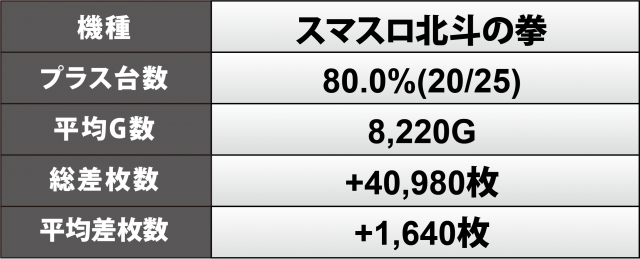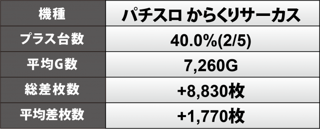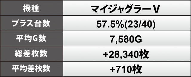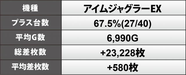 その他では、+1万3千枚弱の台を生み出した『パチスロ からくりサーカス』、プラス台の割合が8割&+8千5百枚超の台を筆頭にハイスコア台が続出&20台の合算が+4万1千枚弱となった『スマスロ北斗の拳』、全体の6割弱がプレイヤーの勝利&40台累計で+2万8千枚超に達した『マイジャグラーⅤ』、全体の3分の2強がプラス&40台総勢で+2万3千枚を超えた『アイムジャグラーEX』など、設置数の多い機種が看板マシンらしい貫録を誇った。