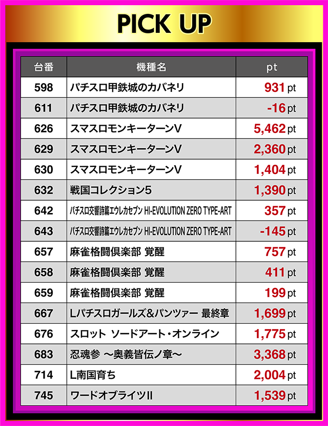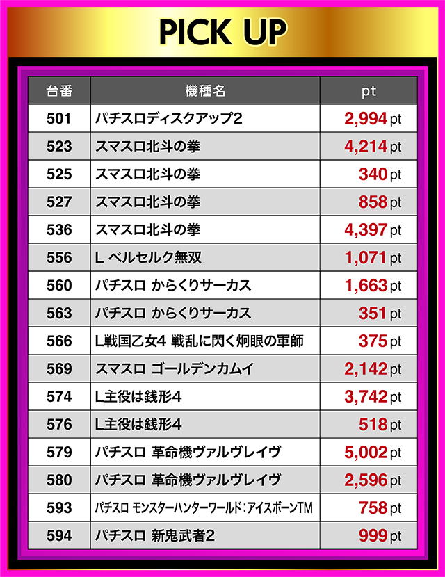 ほかにも、『L主役は銭形4』の574番台が3,742pt、『パチスロ からくりサーカス』の560番台が1,633ptと、多くの台が好結果を残した。