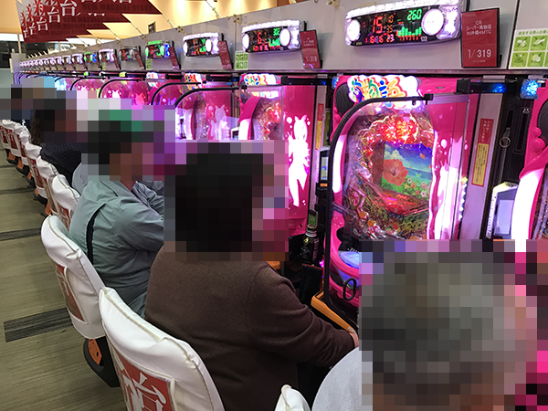 16時ごろの4円パチンコでは、「CRスーパー海物語IN沖縄4」や「CR牙狼 魔戒ノ花」がひときわ支持を集め、盛り上がっていた。
