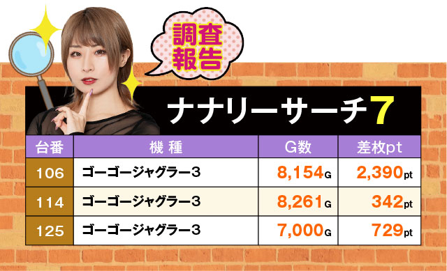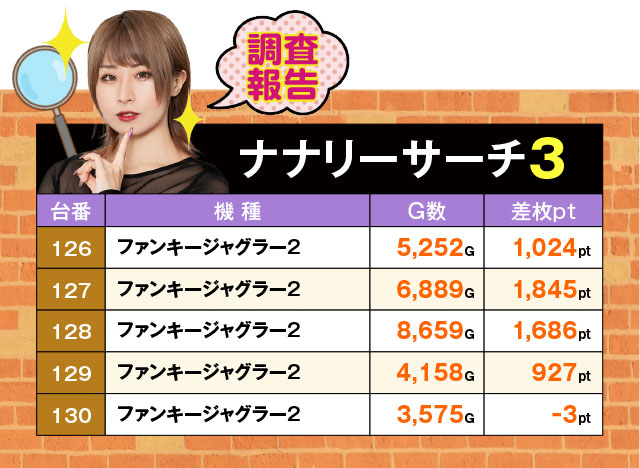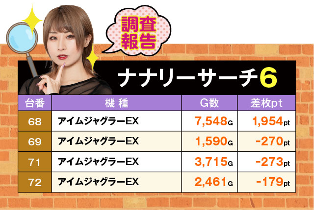 5台並びで4台がプラス。しかも内3台が+1,000pt超えを果たしていた。この『ファンキージャグラー2』のように、並びでプラっている箇所を複数確認することができたので、ナナリーサーチの日は盛り上がっているゾーンを深掘りする立ち回りがセオリーになるかも…!?