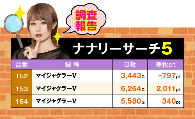 『マイジャグラーⅤ』コーナーでの注目は152~154番台の3台。いずれもコンスタントにGOGOランプをペカらせており、3台そろって好挙動を見せていた。
