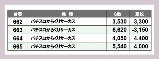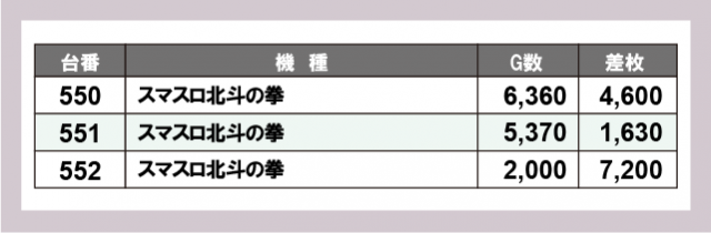 続いては、横並びで盛り上がっていた2機種を紹介。まずは『スマスロ北斗の拳』で、552番台+7,200枚を筆頭にピックアップした3台全てが4ケタオーバーをマーク。圧巻の記録は、同機種を遊技するファンに手ごたえを感じさせたはずだ。次いで『パチスロからくりサーカス』は、4台の平均差枚が+2,138枚をマークし、全台プラス差枚とはならなかったが手応えを感じられる状況だったと窺える。