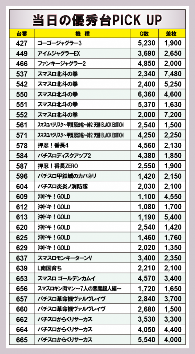 まずは優秀30台のPICK UPをみてみよう。差枚数で大きな数字を打ち立てたのが、『スマスロ北斗の拳』で+7,000枚オーバーが2台。次いで、『沖ドキ!GOLD』613番台+5,400枚で大台突破を記録した。その他、人気スマスロ機を筆頭に『ジャグラー』などノーマルタイプまで様々な機種がランクインしており、各所で熱気と活気に溢れていた。
